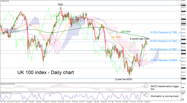 If the price manages from more bullish actions and surpasses the four-month high, immediate resistance would come from the 200-day simple moving average (SMA) currently at 7297. Further up, the index could rest around the 61.8% Fibonacci level, around 7380, while a violation of that point may shift the attention to a bullish outlook with the next target being 7560.
