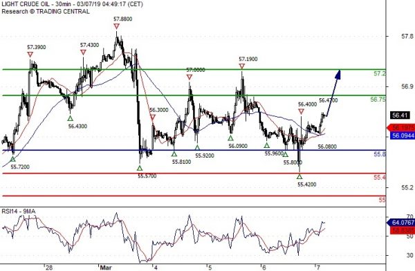 Our preference Long positions above 55.80 with targets at 56.75 & 57.20 in extension.