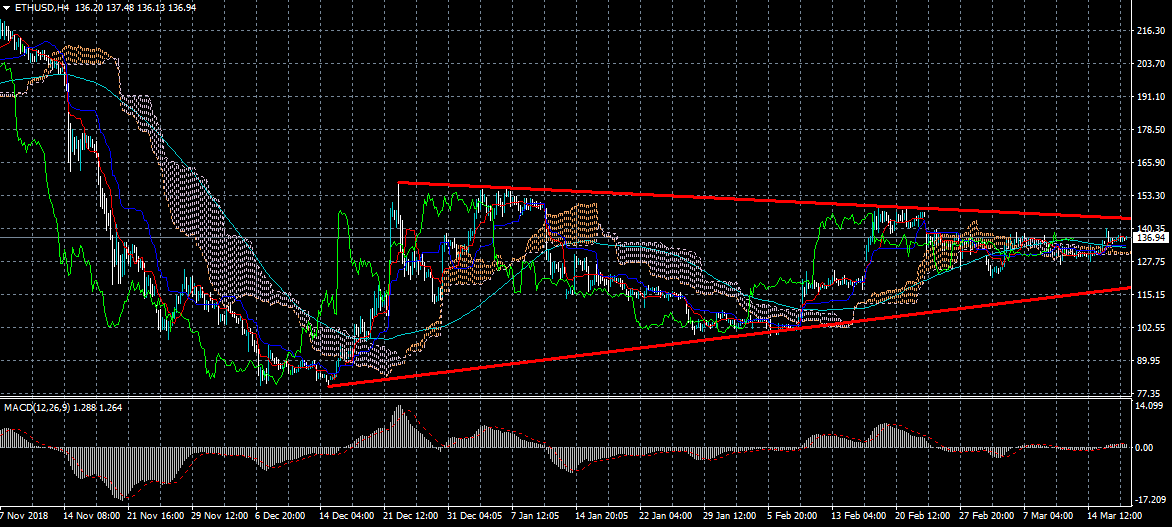 Ethereum is edging closer to major trendline resistance on Wednesday as short-term bulls continue to retain control of the second largest cryptocurrency. The ETHUSD pair has now broken above the Ichimoku cloud on the four-hour time frame, with the $145.00 level the strongest form of resistance above. If bulls can break above triangle resistance, the overall bullish projection of the pattern would take the ETHUSD pair above the $200.00 level.
