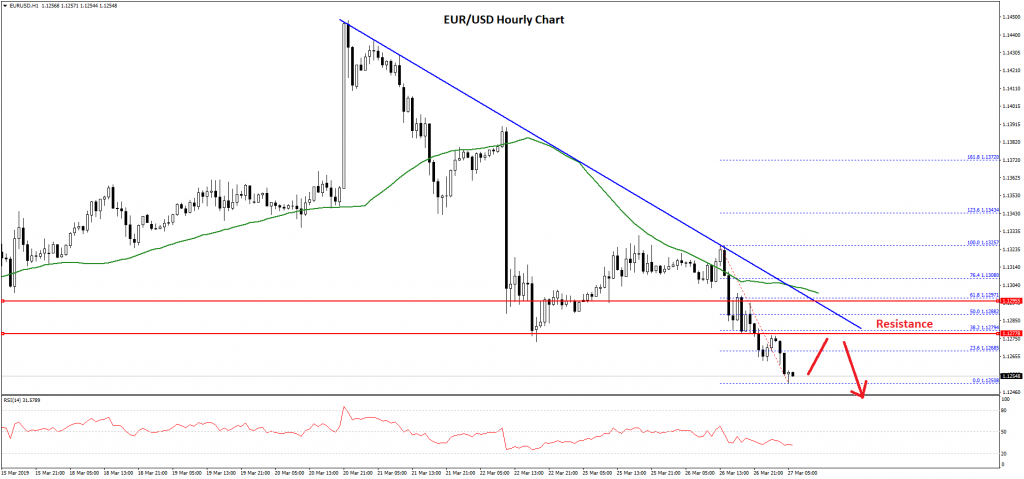 At the moment, the pair seems to be trading in a strong downtrend below 1.1300 and the 50 hourly simple moving average. An initial resistance is near the 1.1270 and the 23.6% Fib retracement level of the recent decline from the 1.1325 high to 1.1250 low.