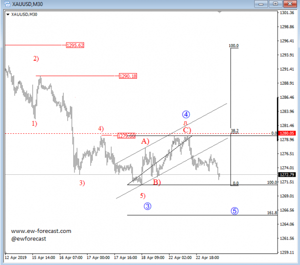 Gold is moving nicely lower after retesting 1280 about we talked last week. So far we can see a very nice move down so I think it’s fifth wave in progress which can be underway to 1260/65 area, where downside can be limited this week as a new three wave rally may come in play.