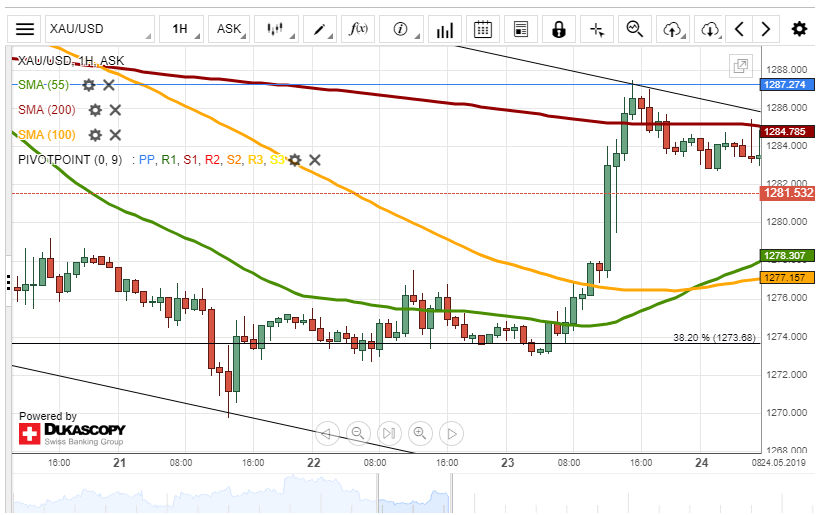 Given that the XAU/USD exchange rate is pressured by the 200-hour SMA, currently located at 1,284.88, it is likely, that some downside potential could prevail in the market, and gold could target the support level formed by a combination of the 55– and 100-hour SMAs circa 1,278.00.
