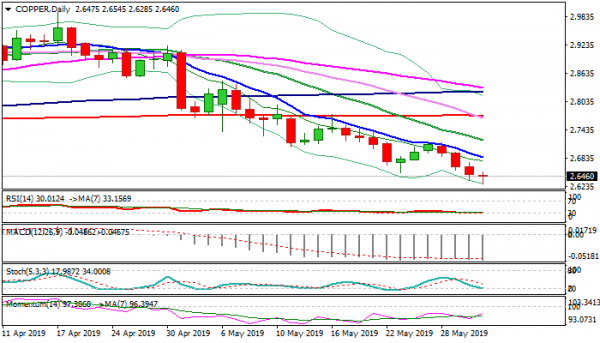 Copper remains heavy on Friday and hits lowest levels since mid-January, pressured by rising concerns about spreading and escalation of trade war which threats to reduce global demand for the metal. Fresh extension lower pressures key support at $2.6250 (200WMA), violation of which would expose multi-month lows at $2.5510/$2.5420 (30 Dec / 12 July 2018). Metal is on track for the seventh straight weekly close in red and also for the biggest monthly fall (approx. 9%) since Jan 2015 that weighs strongly. Bears may take a brief breather above 200WMA as studies are oversold and the price is gaining positive momentum, however, limited upticks are expected to stay below falling daily 10SMA and offer better selling opportunities.
