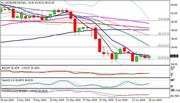 Technical studies remain bearish on daily chart and keep risk of retesting key supports at $50.59/71 (5/12 June lows) while 10SMA caps.