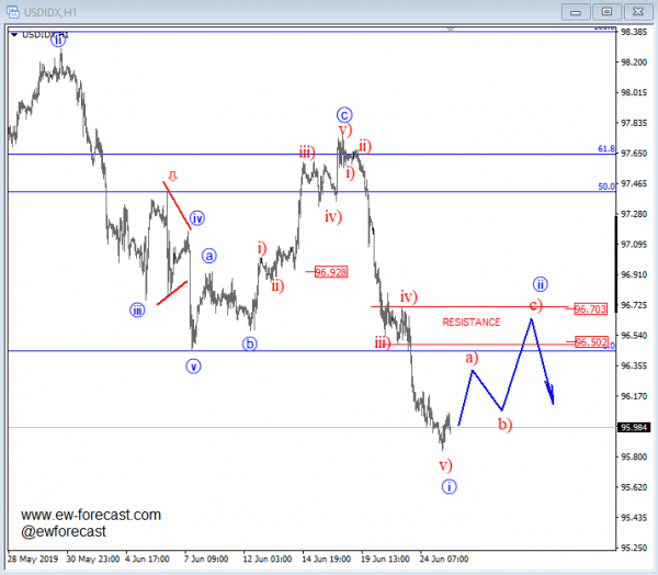 USD Index is clearly bearish, down from 97.7 region, where a former higher degree a-b-c pullback had found resistance and pushed price into a sharp fall. We labelled a new, higher degree, five-wave cycle in progress, with price now unfolding final stages of a wave i as part of the same cycle. After a five-wave fall fully develops, a temporary three-wave retracement may follow with possible resistance near the 96.50/96.70 region.