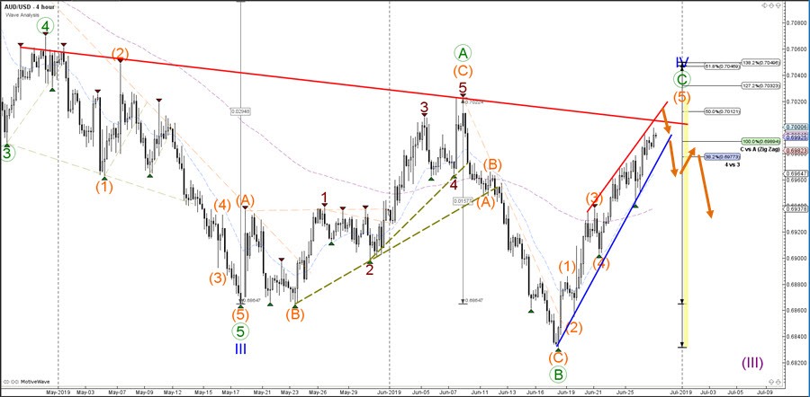 The AUD/USD seems to be completing a bullish wave 5 (orange) pattern within a larger bullish ABC (green) zigzag pattern. If that is true, price should show a bearish bounce soon around the 50% Fibonacci retracement level. The confirmation of a bearish reversal takes place if price is able to break below the support trend line (blue).
