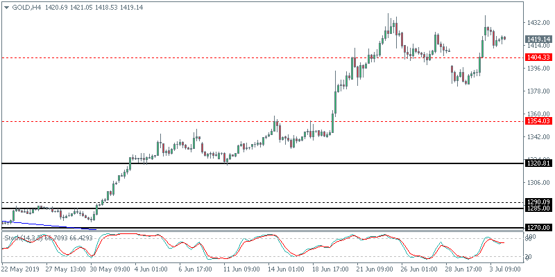 The recent price action in gold saw a retest to the previous six-year high before closing somewhat bearish. The Stochastics oscillator on the daily chart signals a lower high, indicating a possible move to the downside. Price will need to close below 1404.00 in order to confirm the downside bias. The next downside target is seen at 1354.00.