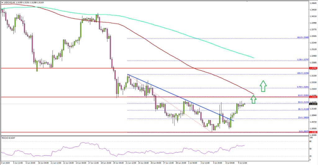• USD/CAD traded above a bearish trend line with resistance near 1.3080 on the 4-hours chart.