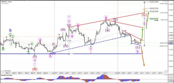 From a wave perspective, the EUR/USD seems to have completed a bearish ABC wave (purple) but this wave outlook is only valid if price stays above the 100% Fibonacci level and 1.1180 support. For price to confirm this wave pattern, it would need to break above 1.1250 and 1.13 resistance levels with decently strong impulsive price action.