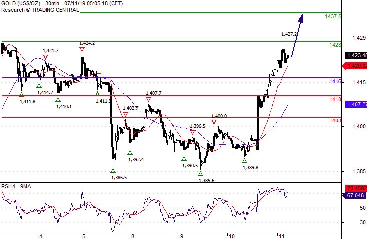 Our preference Long positions above 1416.00 with targets at 1428.00 & 1437.50 in extension.