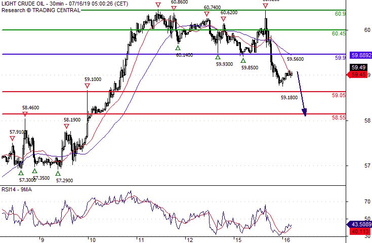 Our preference Short positions below 59.90 with targets at 59.05 & 58.55 in extension.