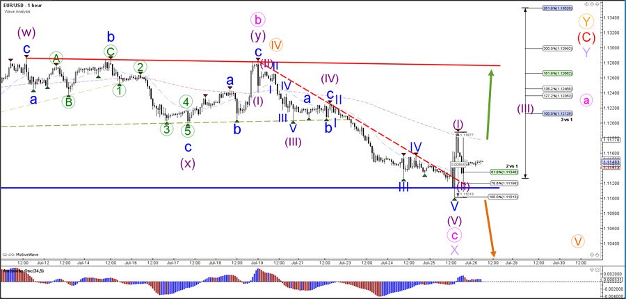 The EUR/USD could be building a wave 1-2 (purple) pattern as long as price stays above the 100% Fibonacci retracement level of wave 2 vs 1. The 1.11 support remains a key decision zone for a bounce or break.
