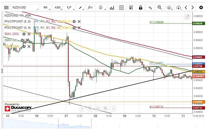 The 50– hour simple moving average pressured the New Zealand Dollar lower against the US Dollar on Monday. The currency pair breached the lower band of an ascending trendline at 0.6450 during Monday’s trading session.