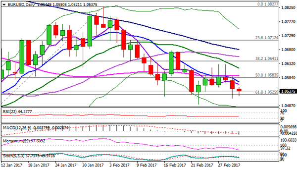 Recent spike highs at 1.0630 zone that were left on strong upside rejections, mark another pivotal barrier, break above which would activate alternative scenario and neutralize immediate downside threats.