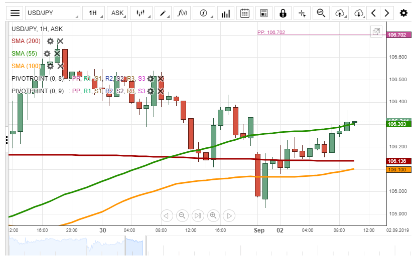 At the end of last trading week, the US Dollar depreciated slightly against the Japanese Yen. During Monday morning, the USD/JPY currency pair tested the support formed by the 100– and 200-hour SMAs, located circa 106.10.