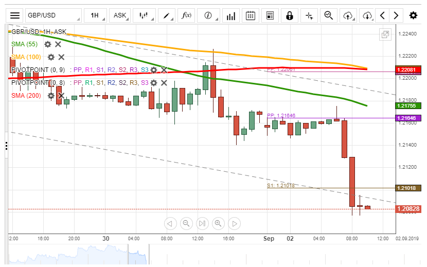 During the previous trading session, the GBP/USD exchange rate tested the resistance formed by the 55-, 100– and 200-hur SMAs located in the 1.2200/1.2220 range. During today’s morning the rate tumbled to the support level—the weekly S1 at 1.2102.