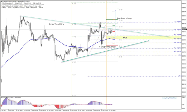 The EUR/GBP has recently made a u-turn after the V shaped reversal formed and pushed the price from the D L4 support. At this point the POC zone is 0.8790-0.8805 (D L3, EMA89, ATR pivot, 50.0, W H3, historical buyers) and if the price gets into the zone again, we might see another push to the upside targeting 0.8833. If the price manages to stay above the inner trend line at 0.8820, I expect D H3 retest -0.8833 and hourly close above D H3 should give another positive impulse to the pair that with targets at 0.8853 and 0.8885.