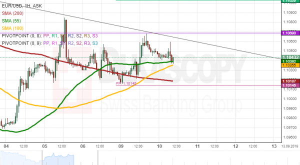 Yesterday, the EUR/USD currency pair re-tested the upper boundary of the falling wedge pattern located circa 1.1070. During Tuesday morning, the pair was testing the support level formed by the 55– and 100-hour SMAs circa 1.1040.