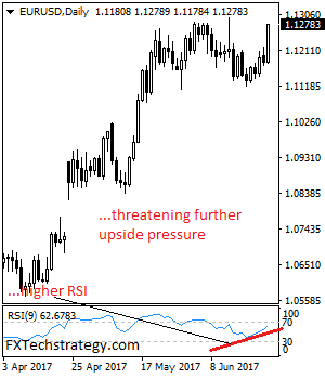EURUSD: With the pair seen rallying on Tuesday following its Monday price reversal, more strength is envisaged in the days ahead. Resistance comes in at 1.1300 level with a cut through here opening the door for more upside towards the 1.1350 level. Further up, resistance lies at the 1.1400 level where a break will expose the 1.1450 level. Its daily RSI is bullish and pointing higher suggesting further strength. Conversely, support lies at the 1.1250 level where a violation will aim at the 1.1200 level. A break of here will aim at the 1.1150 level. All in all, EURUSD faces further upside pressure.