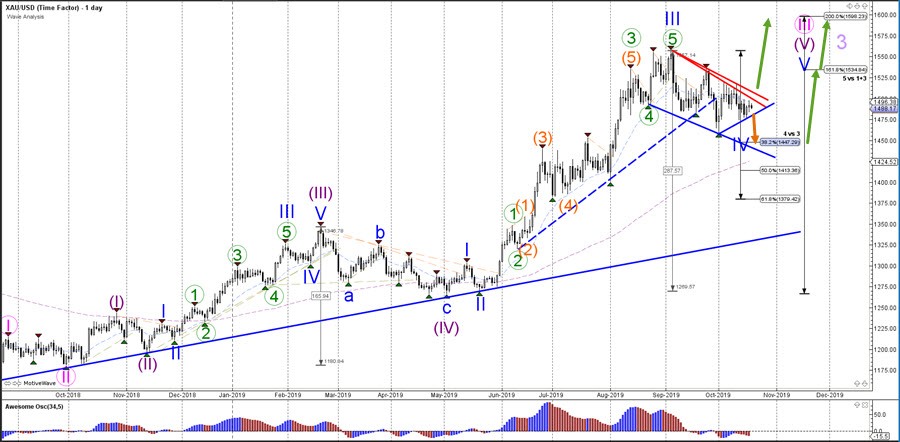 The XAU/USD seems to have completed a bullish ABC (green) pattern within potential wave 4 (dark red). This remains valid as long as price stays below the resistance trend lines (red). A bearish breakout below the support line (blue) could confirm one more bearish push as part of a wave 5 (dark red) of wave C (orange) of wave 4 (blue).