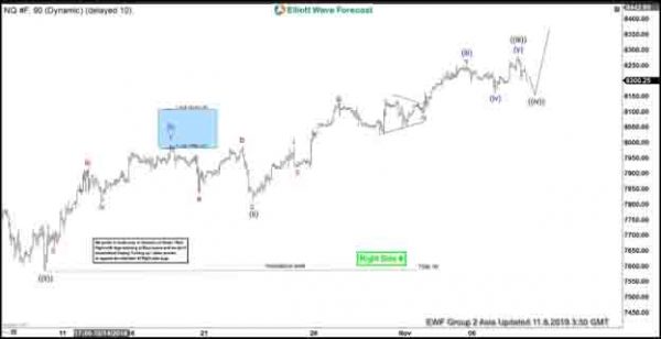 Short Term Elliott Wave View on Nasdaq Futures (NQ_F) shows 5 waves impulsive Elliott Wave rally from October 3, 2019 low. On the chart below, we can see the pullback to 7586.99 ended wave ((ii)). The Index has resumed higher and wave ((iii)) has completed at 8282.25. Subdivision of wave ((iii)) unfolded as 5 waves impulse in lesser degree. Up from 7586.99, wave (i) ended at 7994.75 and wave (ii) pullback ended at 7810.25. Index then resumed higher in wave (iii) towards 8248, and wave (iv) pullback ended at 8161. The final leg wave (v) of ((iii)) ended at 8282.25. Wave ((iv)) pullback is in progress in 3, 7, or 11 swing before the rally resumes. We don’t like selling the Index. As far as pivot at 7586.99 stays intact, expect dips to find support in the sequence of 3, 7, or 11 swing for further upside.