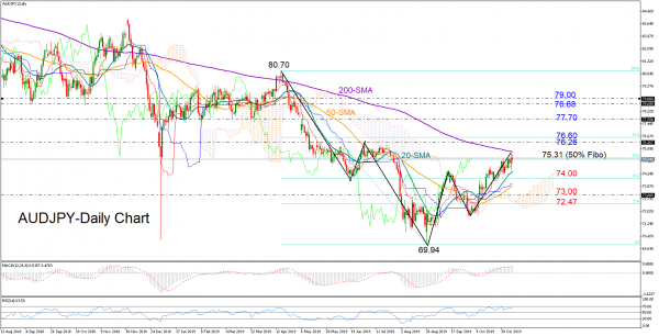 AUDJPY stretched to a fresh 3 ½-month high of 75.65 and near the 200-day simple moving average (SMA) on Thursday but it found hard to close comfortably above the 50% Fibonacci of the downleg from 80.70 to 69.94.