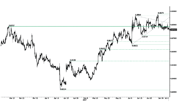 EUR/GBP has broken downtrend resistance triggering a move lower. Hourly support is given at 0.8719 (16/06/2017 low). Expected to show continued weakness.