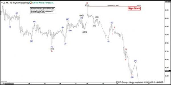 Oil has extended lower and short term Elliott Wave view suggests the decline from 1.8.2020 high is unfolding as a zigzag Elliott Wave structure. Down from January 8 high, wave A ended at 57.36 as a 5 waves impulsive structure. Bounce in wave B ended at 59.73 as a zigzag structure. Up from 57.36, wave ((a)) of B ended at 58.98, wave ((b)) of B ended at 58.27, and wave ((c)) of B ended at 59.73.