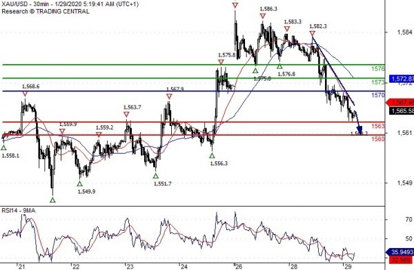 Our preference Short positions below 1570.00 with targets at 1563.00 & 1560.00 in extension.