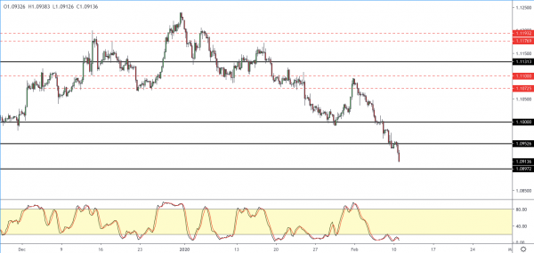 With the current trend, the common currency is on track to test the lower support at 1.0897. This marks a retest of the early October 2019 lows.