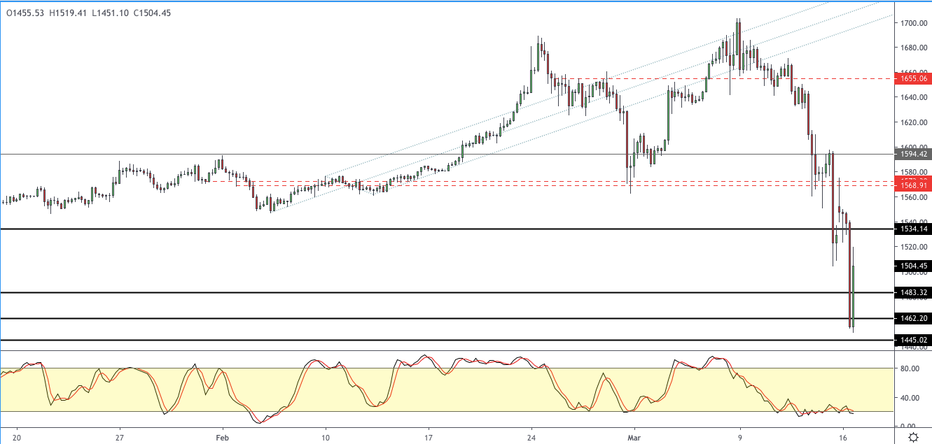 The precious metal continued its descent, unmoved by the Fed’s actions over the weekend. Price fell to fresh lows of 1451.07 intraday before pulling back. This also coincides with the 200-day moving average which hasn’t been tested since May 2019. If moving average support along with the horizontal support at 1462 holds, we can expect some rebound. The main upside resistance is seen at 1534, followed by 1569.