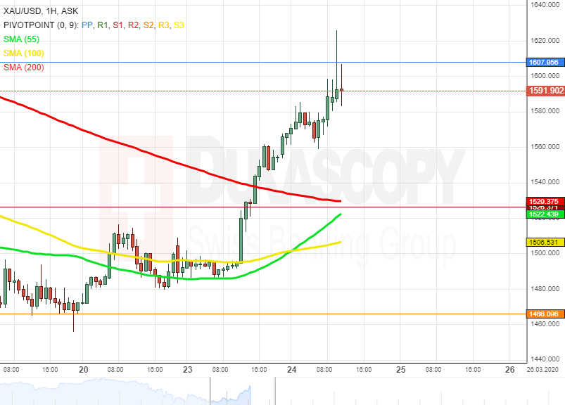 On Monday, the XAU/USD exchange rate raised to the 1,560.00 level. During today’s morning, the rate jumped to the monthly PP at 1,607.97.