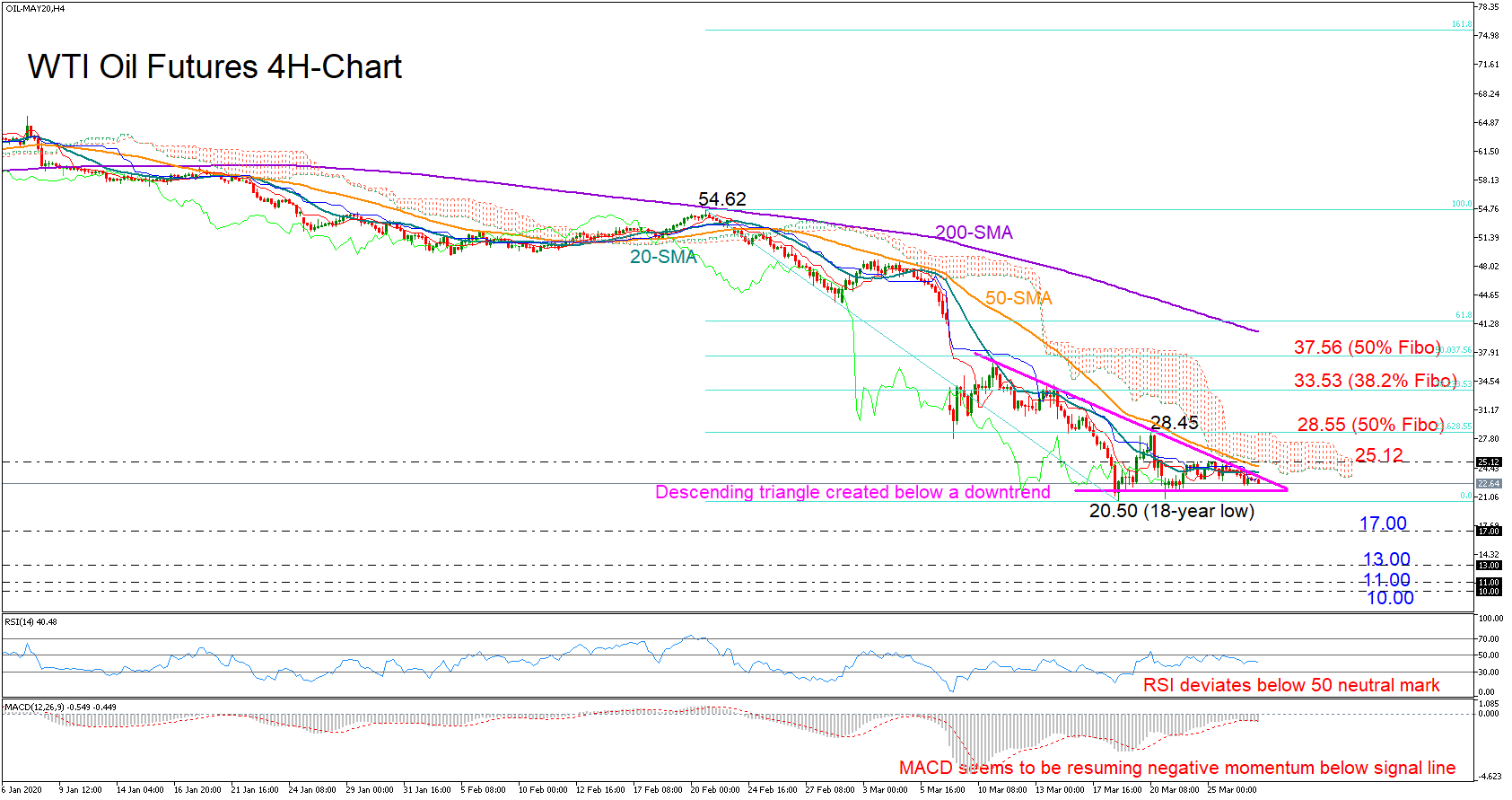WTI oil futures for May delivery have been in quite a sideways trade since the plunge to an 18-year low of 20.50 last week on the four-hour chart.