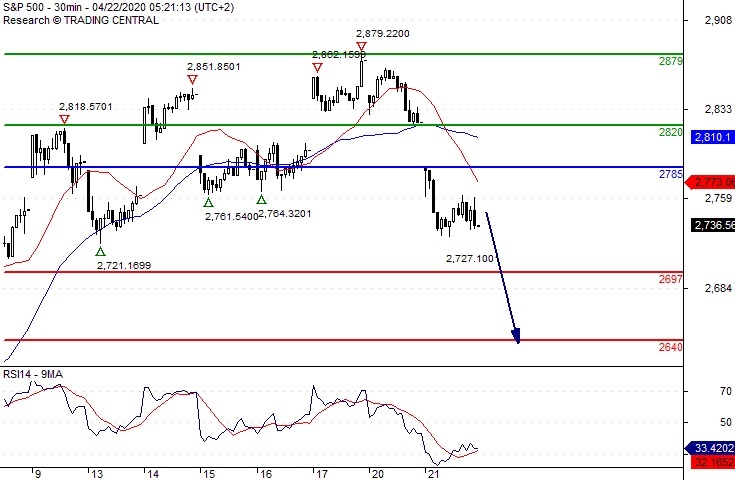 Our preference Short positions below 2785.00 with targets at 2697.00 & 2640.00 in extension.