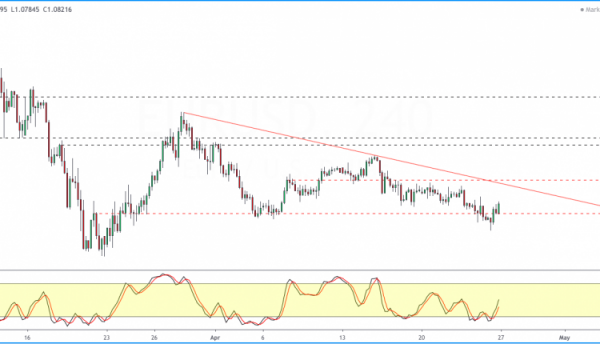 As a result, price action is consolidating into a descending triangle. Unless prices breakout above the trend line, we expect stronger declines if the euro loses the 1.0787 handle.