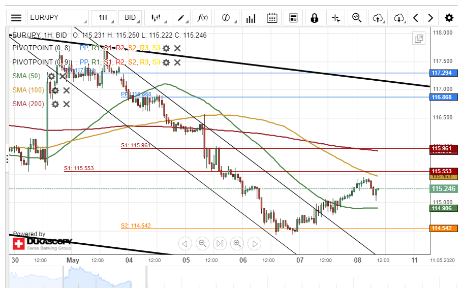 Currently, the exchange rate is trading near a resistance cluster formed by the monthly S1 and the 100– hour SMA at 115.33.