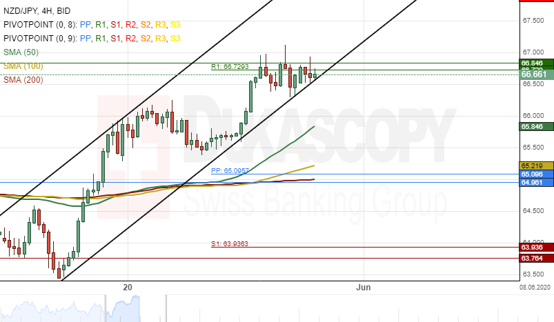 As for the near future, the exchange rate will most likely continue to trade in the narrow ascending channel pattern. The potential target for the NZD/JPY pair would be near the 68.50 area during the following trading sessions.