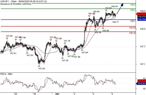 Our preference Long positions above 108.70 with targets at 109.10 & 109.30 in extension.
