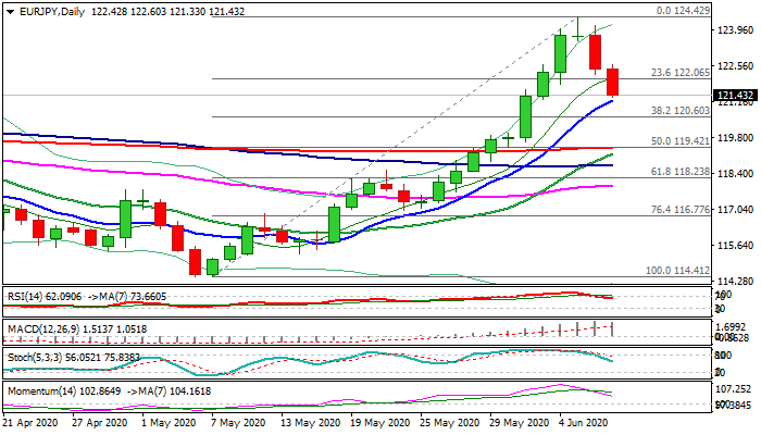 Fresh weakness (0.84% down since Asian opening today) took out initial support at 122.06 (Fibo 23.6% of 114.41/124.42) and pressuring rising 10DMA (121.21), break of which would open way for test of key Fibo support at 120.60 (38.2% of 114.41/124.42 / top of rising 4-hr cloud).