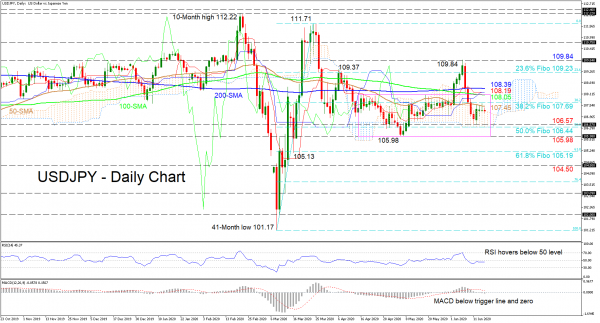 To the upside, immediate resistance could occur from the 50-day SMA at 107.45 and the 38.2% Fibo of 107.69. Moving higher, the area from the 100-day SMA of 108.05 until the 200-day SMA at 108.39, which includes the Ichimoku lines at 108.19, could provide additional constraints. Overrunning these borders, the price may shoot for the 23.6% Fibo of 109.23 before meeting the 109.84 peak.