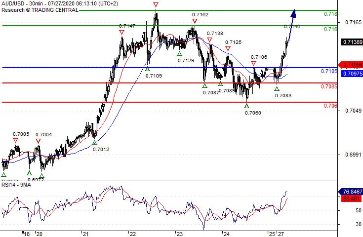 Our preference Long positions above 0.7105 with targets at 0.7160 & 0.7180 in extension.