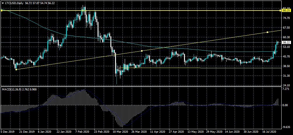 Litecoin has moved to a fresh multi-month trading high, with the popular cryptocurrency reaching the $58.00 resistance level. Traders are likely to buy any dips towards the $52.00 area in anticipation of further upside towards the $80.00 resistance level. Overall, the LTCUSD pair is now technically bullish and has invalidated a bearish head and shoulders pattern on the lower time frames.