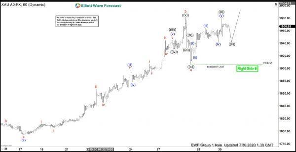 Gold 1 hour chart below shows that the metal has ended the cycle from July 6 low in wave 3 at 1981.20 high. The metal has now broken to new all-time high above September 2011 high. The rally from July 6 low unfolded as a 5 waves impulsive Elliott Wave Structure. Up from July 6 low, wave ((i)) ended at 1818.14 high and the dip in wave ((ii)) ended at 1789.87 low. From there, the metal then continued higher and ended wave ((iii)) at 1945.25 high. The pullback in wave ((iv)) ended at 1930.50 low. The metal then extended higher in wave ((v)), which ended at 1981.20 high. This ended wave 3 in larger degree.