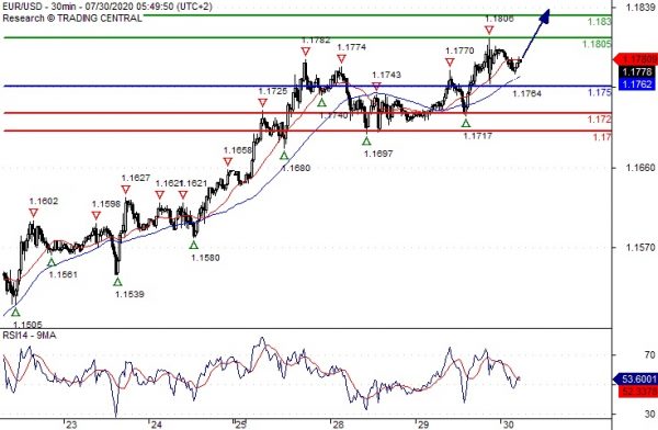 Our preference Long positions above 1.1750 with targets at 1.1805 & 1.1830 in extension.
