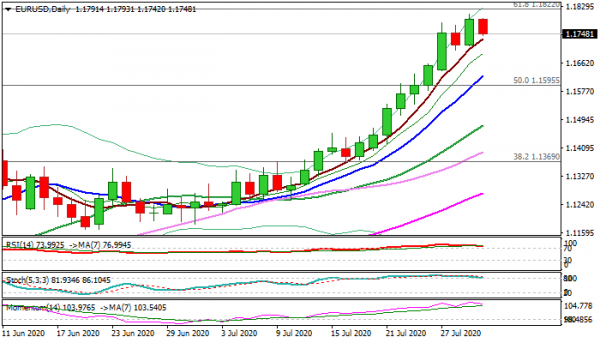 Dips on profit-taking and overbought studies are expected to provide better buying opportunities and should find ground above supports at 1.1637/22 (week’s low / rising 10DMA), to keep immediate focus at 1.1822/82 targets (Fibo 61.8% of 1.2555/1.0635 / falling 100MMA)