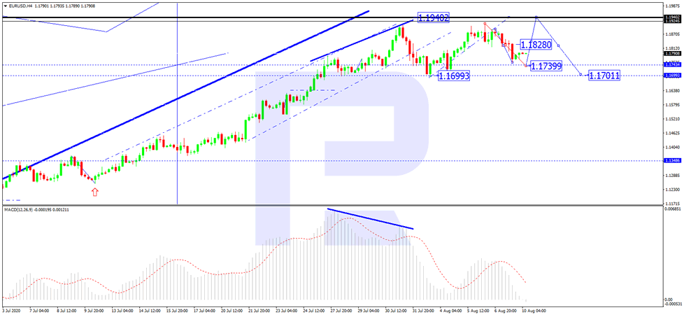 In the H4 chart, EUR/USD is correcting downwards to reach 1.1740 and may later form one more ascending wave with the target at 1.1940. After that, the instrument may start a new decline to 1.1700. From the technical point of view, this scenario is confirmed by MACD Oscillator: its signal line is moving downwards outside the histogram area, thus indicating a correction on the price chart.