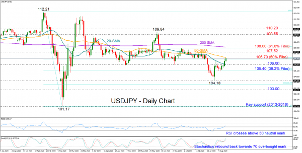 The price is currently facing the 50% Fibonacci of the 112.21-101.17 downleg at 106.70 and the 50-day SMA, a break of which is required to boost momentum towards the 107.52- 108.00 resistance zone. The positive slope in the RSI, which has crossed above its 50-neutral mark, and the rebound in the stochastics are backing this scenario, though the price needs to clear its nearby obstacles to extend higher.