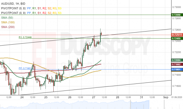 The Australian Dollar surged by 61 pips or 0.85% against the US Dollar on Wednesday. The currency pair tested the weekly resistance level at 0.7244 during yesterday’s trading session.