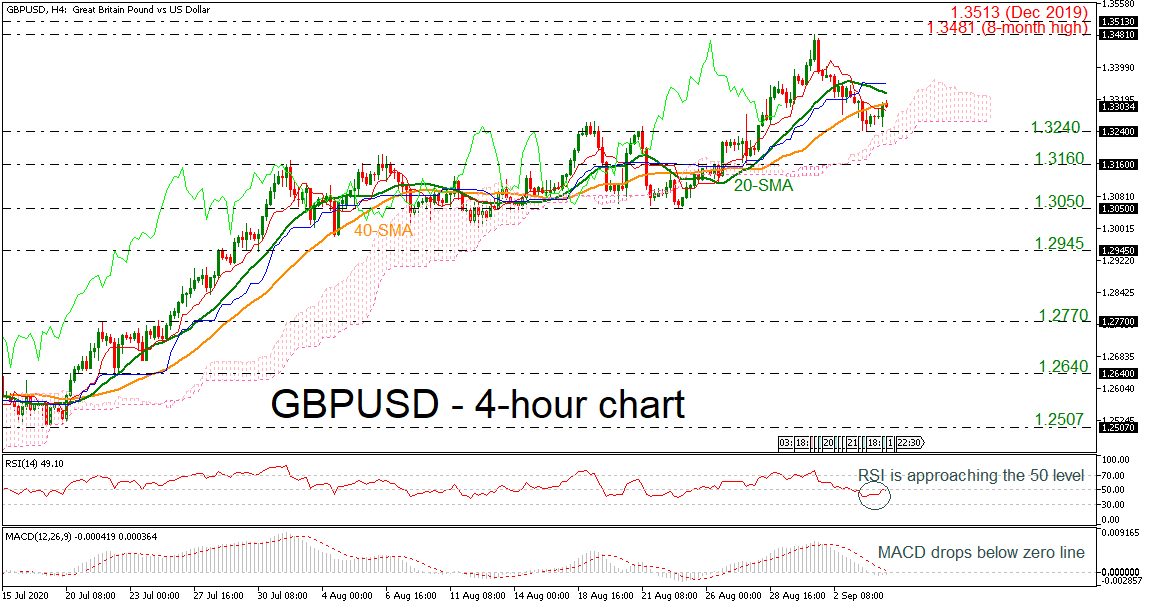 GBPUSD held in losses this week, dropping to the 1.3240 support level and near to the Ichimoku cloud. The RSI in the four-hour chart continues to miss direction in bearish area, while the MACD is holding below the zero line. The red Tenkan-sen keeps flattening below the blue Kijun-sen line, reducing chances for a meaningful recovery in the short-term trading.