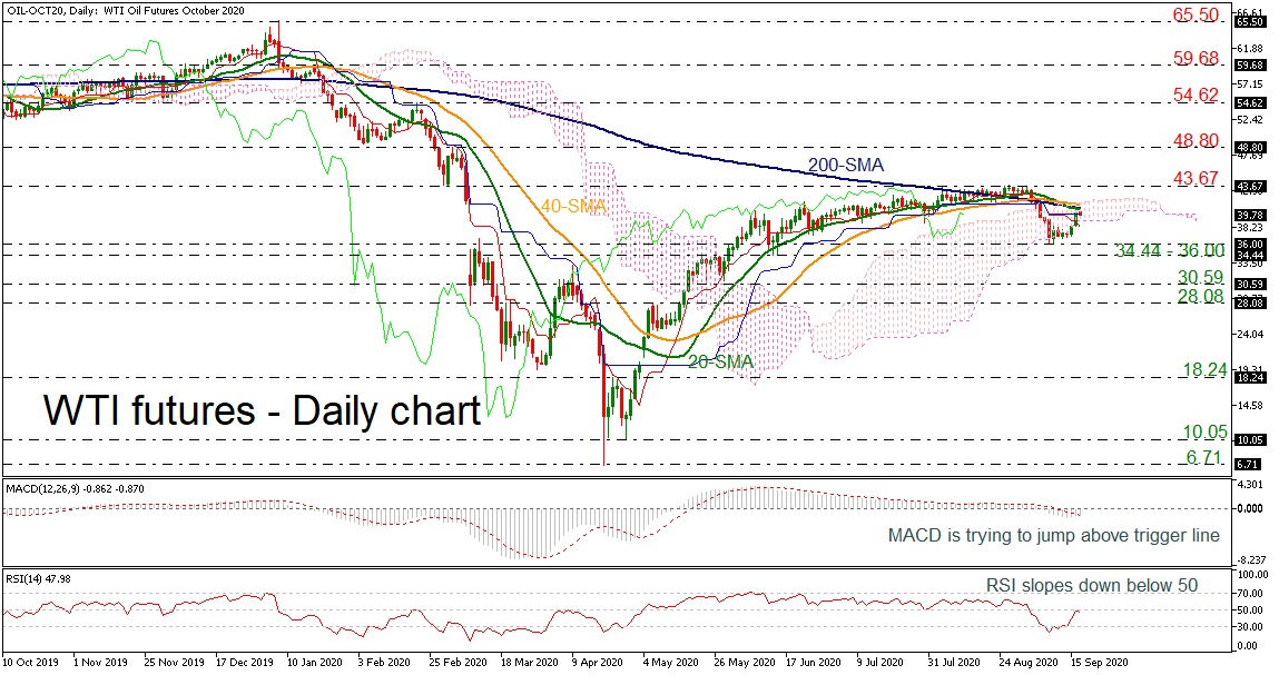 WTI crude oil futures have reversed back to the upside, flirting with the 200-day simple moving average (SMA) and the short-term MAs as well as the Ichimoku cloud. The price rebounded on the 36.00 psychological mark and the MACD oscillator posted a bullish crossover with its trigger line in the negative territory. Although the RSI challenged the 50 level, it failed to surpass it and is ticking down.